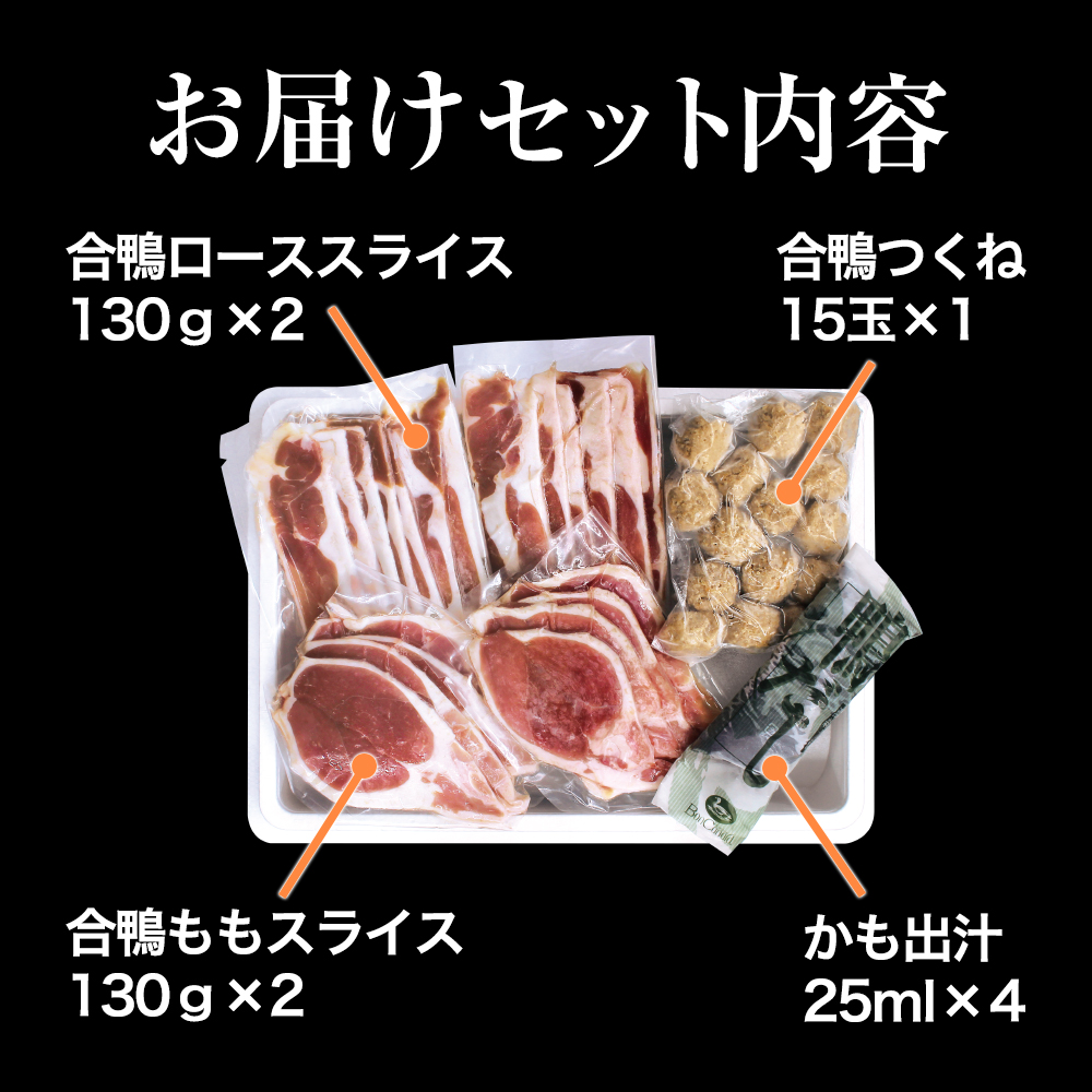 - 合鴨ローススライス130g×2、合鴨つくね15玉×1、合鴨ももスライス130g×2、合鴨だし25ml×4個