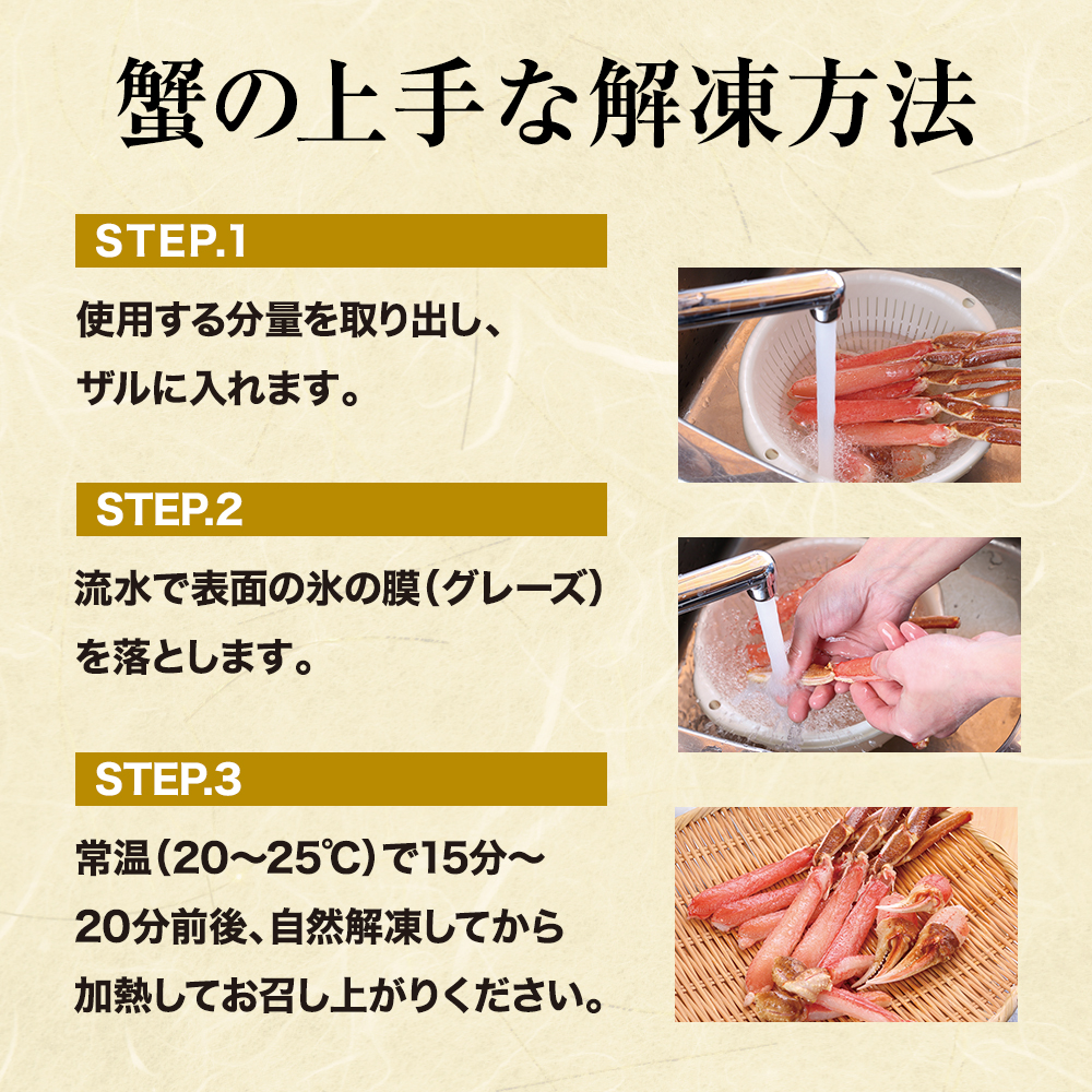 水揚げしてすぐに冷凍しているので旨味が詰まっています。生のカニならではのプリップリの食感をお鍋でお楽しみください。