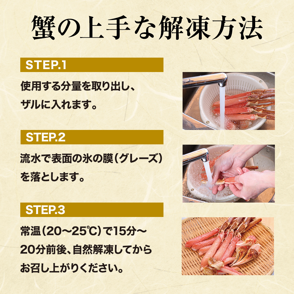 - 食べ切れる分量のカニを取り出し、流水で表面の氷の膜を落とします。常温(20~25℃)で20分前後自然解凍してください。(室温により、調整してください)芯が凍っているくらいの半解凍状態になればOKです。お好みの調理法でお召し上がりください。解凍後そのままお召し上がりいただけます。